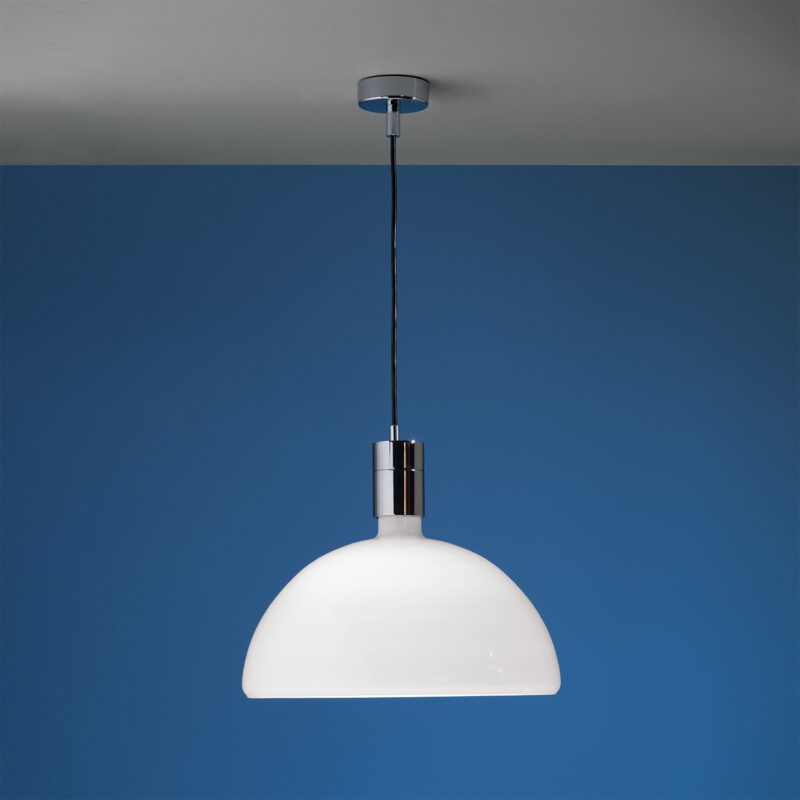 La collection Albini AM/AS représente la philosophie rationaliste de l’architecte milanais. Un design de 1969 qui combine les formes linéaires avec l’extrême qualité des matériaux utilisés, comme le verre soufflé des diffuseurs. Le but est de gérer les différents volumes de l’espace avec un seul design: plafond, mur, sol et table.