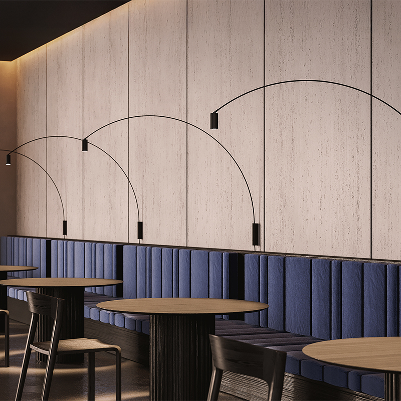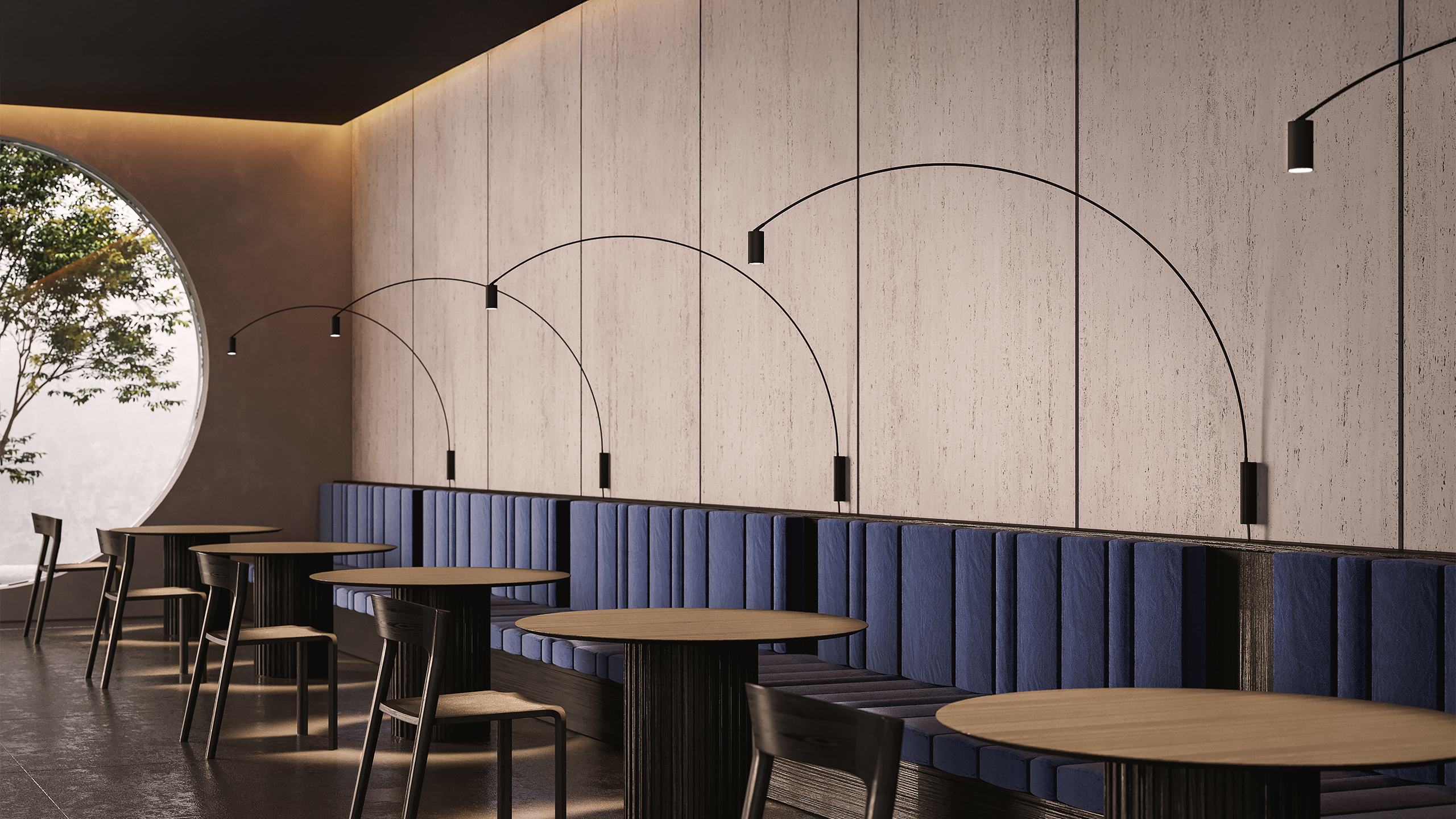 Essential aesthetics and pure functionality. The swivelling arc in painted iron allows wide movement, and gives the opportunity to both interact and decorate the space.
