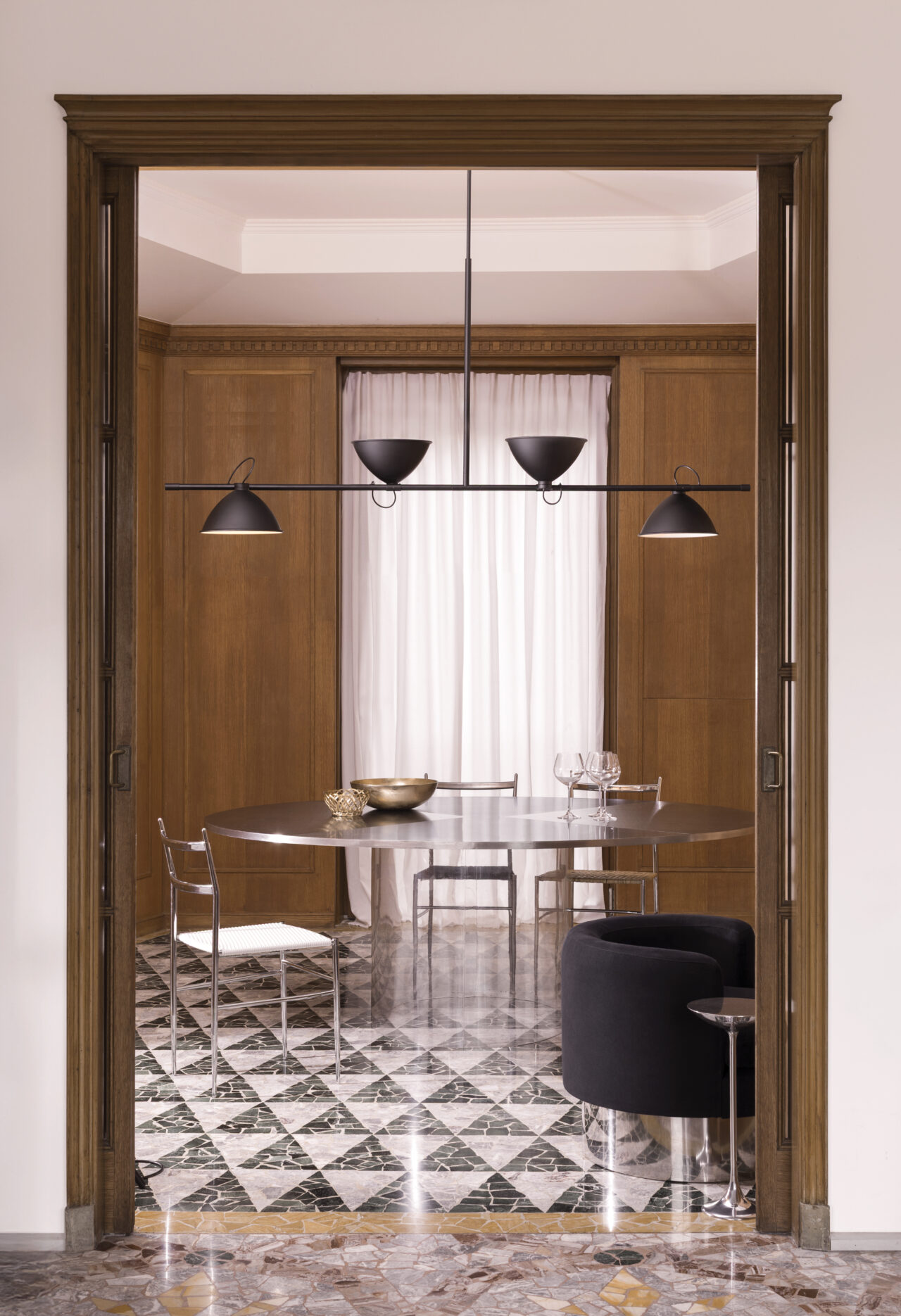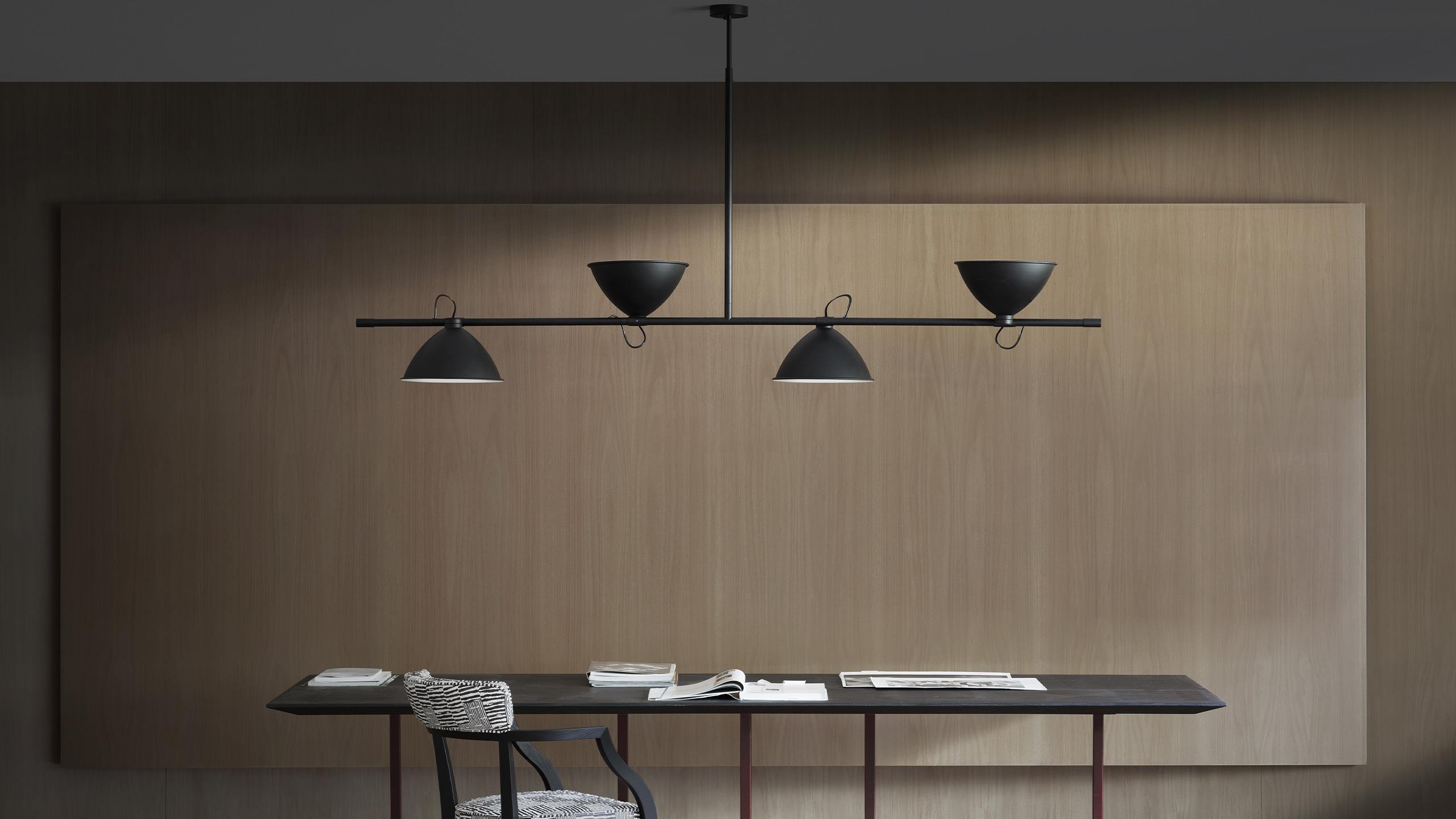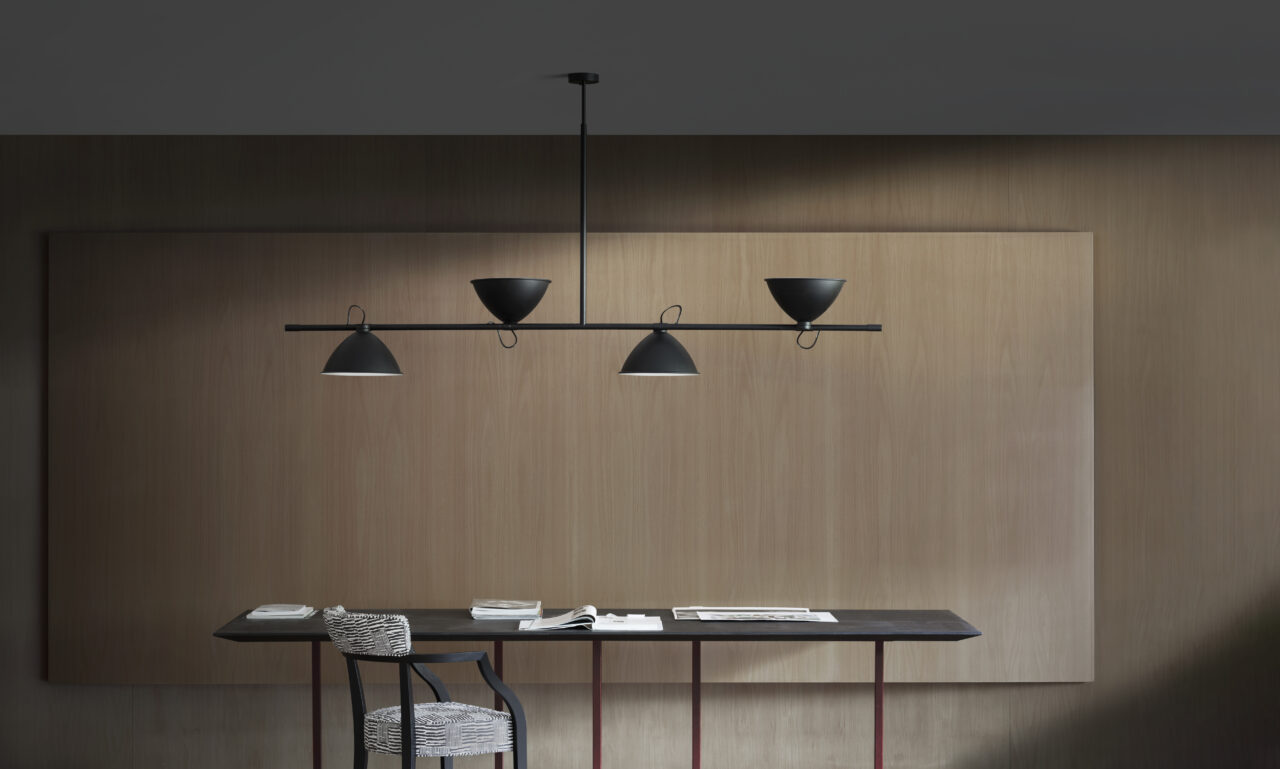 For the Casa de Vidro, a symbolic project of Brazilian modernist architecture, Lina Bo Bardi designed in 1950 LBB01, a paradigm in the world of lighting. An essential and geometric design in which lines and volumes touch and intersect, in total continuity with the design style of the house in São Paulo. The telescopic stem and 340° adjustable diffusers in black painted aluminium allow direct and indirect lighting, while the interior finish is matt white.